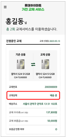 웹사이트에서 교체 신청하여 당사 안내에 따라 교체수수료와 교체보증금을 납부하면 하이마트에서 교체 제품이 준비 완료되었다는 연락을 드립니다.